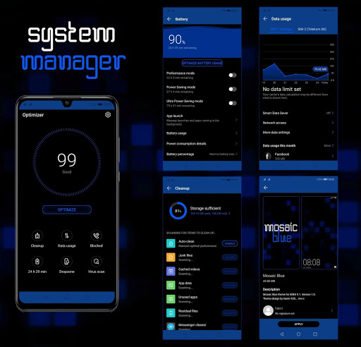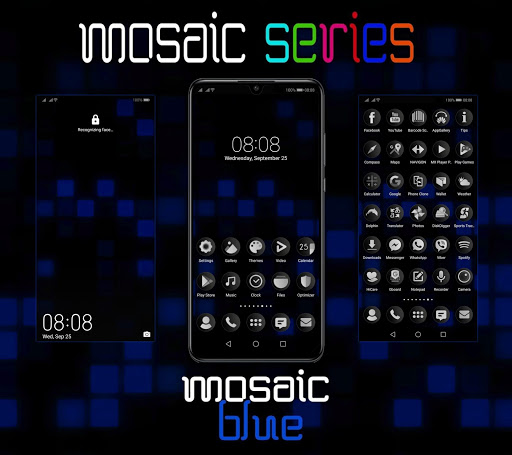 Tema Mosaic Blue untuk EMUI 9.1 berbeda dan tidak dapat diperbarui dari sistem EMUI yang lebih lama. Ada banyak kompromi grafis, karena ikon bilah status dan ikon bilah navigasi tidak terlihat pada latar belakang hitam pada perangkat dengan layar LCD (tanpa mode gelap).