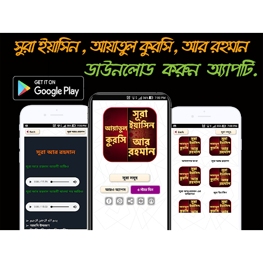 সুরা ইয়াসিন, সূরা আর রহমান পবিত্র আল কোরআনের সূরা এবং আয়াতুল কুরসী সূরা বাকারার ২৫৫ নাম্বার আয়াত নিয়ে আমাদের এই অ্যাপ।