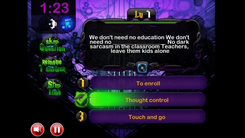 Anda mendengar menahan diri dari sebuah lagu dan membaca bagian dari paduan suara ini, bersama dengan pilihan untuk menyelesaikan hilang. Tantangan Anda adalah untuk memilih alternatif yang melengkapi paduan suara sesuai dengan apa yang Anda dengar. Jika Anda menyelesaikan paduan suara dengan benar, Anda bisa mendapatkan bonus juga memukul apa nama lagu dan band. Bila Anda tidak tahu jawabannya, Anda dapat menggunakan sumber daya bantuan: 'Berhenti Time', 'menghilangkan alternatif' dan 'melewatkan' musik. Membuat poin sebanyak yang Anda bisa dengan menyelesaikan sebanyak chorus dalam waktu yang Anda miliki! Ini adalah game edukasi untuk belajar menyanyi beberapa lagu paling terkenal.