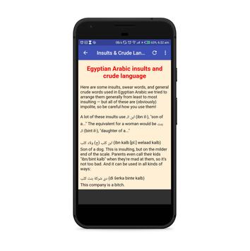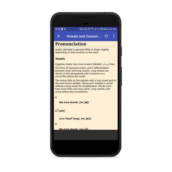 This App is based on the metropolitan Egyptian Arabic based on the pronunciation of urban Egyptians in Cairo.