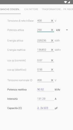 - Potenza reattiva del banco di condensatori per la compensazione del fattore di potenza (cos φ) e della capacità (µF) dei condensatori