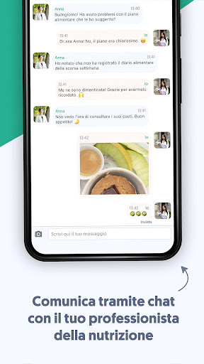Porta il tuo professionista della nutrizione in tasca ovunque, consulta il piano alimentare, registra i tuoi pasti e fai delle domande ogni volta che ne hai bisogno, attraverso una chat di messaggi.