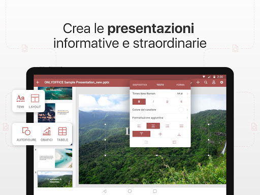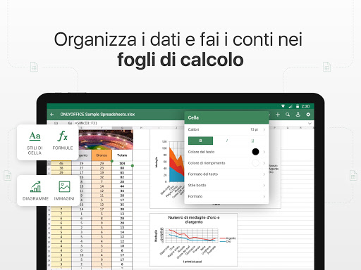 Con ONLYOFFICE sarai in grado di creare e modificare tutti i tipi di documenti per ufficio: documenti di testo, fogli di calcolo e presentazioni. I formati di base sono DOCX, XLSX e PPTX. Sono supportati anche tutti gli altri formati popolari (DOC, XLS, PPT, ODT, ODS, ODP, DOTX).
