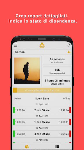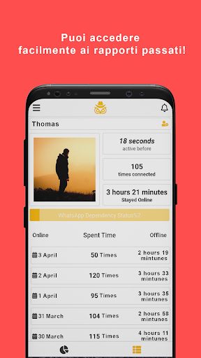 Puoi scoprire quanto tempo hai trascorso nell'applicazione con l'applicazione di monitoraggio per whatsapp. Per questo, puoi ricevere notifiche nelle tue transazioni online e offline. Tiene un rapporto giornaliero delle ore che inserisci ed esci dall'applicazione, puoi accedere facilmente ai rapporti passati. In questo modo, puoi monitorare istantaneamente quanto tempo passi sull'app per whatsapp.