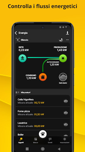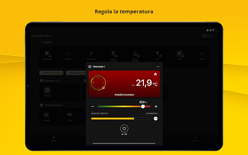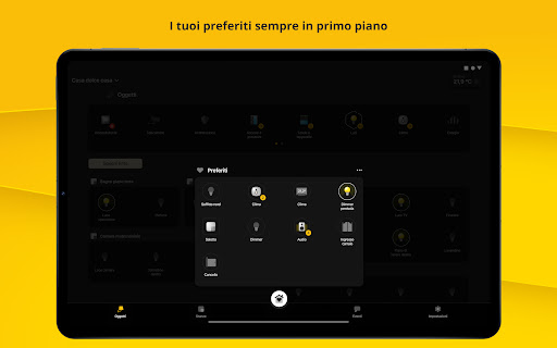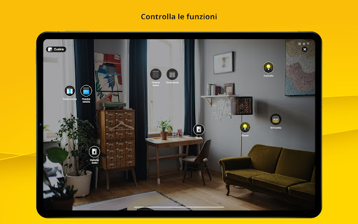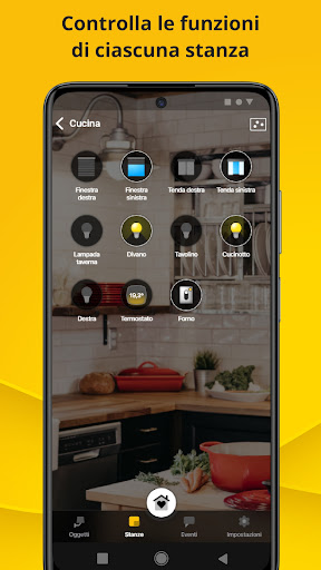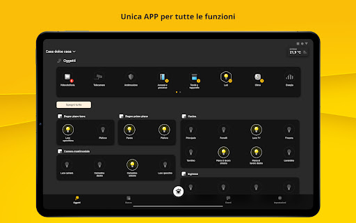 L’interfaccia è organizzata per consentire la navigazione intuitiva per funzioni (“Oggetti”) o per ambienti (“Stanze”): il linguaggio iconografico proprio dei principali sistemi operativi, affiancato da etichette personalizzabili e la gesture tipica di mondo mobile (swipe) rendono l’utilizzo estremamente intuitivo della domotica Vimar.