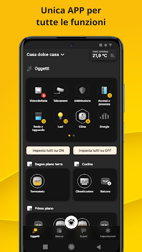 Controlla la tua casa connessa, basata sul sistema integrato VIEW IoT smart systems, con una interfaccia semplice ed intuitiva: tutte le funzioni della casa intelligente sono a portata di mano fin dal primo avvio ed in totale sicurezza, dopo aver inserito le proprie credenziali di accesso, generate sul portale Cloud VIMAR. L’App non richiede nessuna configurazione perché eredita la programmazione già effettuata dall’installatore elettrico professionista con i vari tool di configurazione dei vari sistemi installati nell’edificio (VIEW Wireless o By-me Plus, By-alarm, Videocitofonia Elvox, telecamere Elvox).
