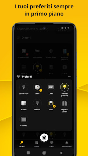 Tramite l’APP VIEW è possibile creare liberamente scenari, personalizzare una pagina di preferiti da cui accedere direttamente alle funzioni più frequenti, personalizzare i programmi clima ed irrigazione con la massima flessibilità, gestire gli utenti ed i permessi associati al sistema, aggiungere il controllo di lampadine e strisce led del sistema Philips Hue, selezionare le notifiche push che desidera ricevere.