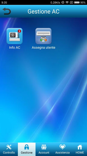 2. Gestione: Permette di registrare nuovi climatizzatori e di condividere il controllo con altri utenti.