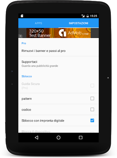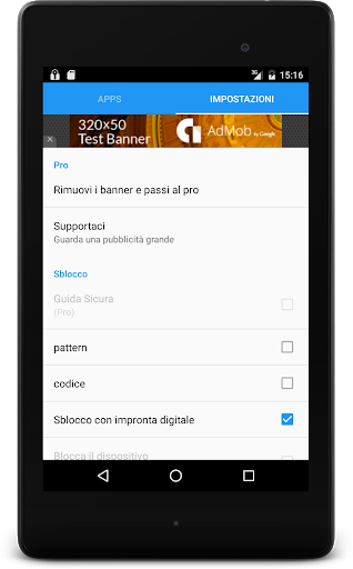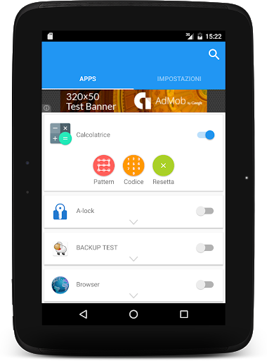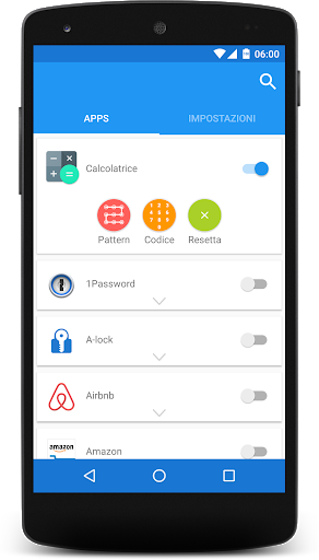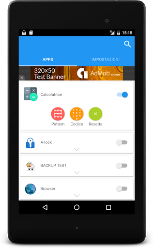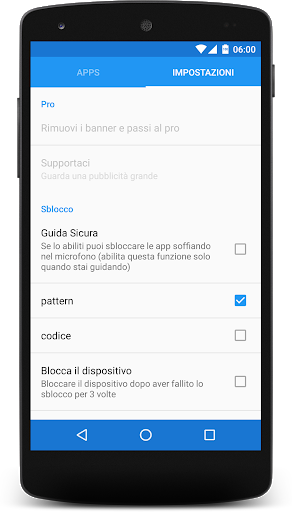 A-lock consente di poter impostare due tipologie di sblocchi, definiti main lock (Pattern o Codice), dopo aver impostato almeno uno dei due sarà possibile bloccare le app che si preferiscono tenere al sicuro.