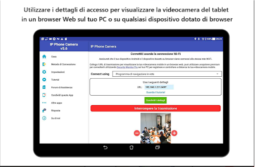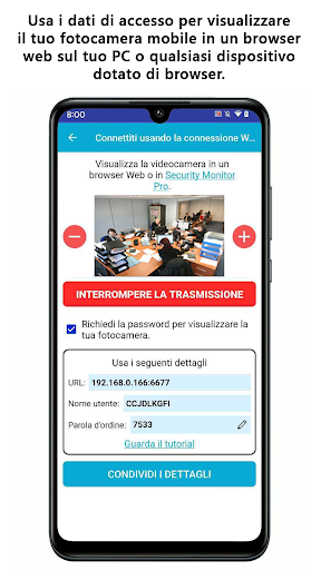 • Visualizza la tua videocamera mobile nel browser o in un software di videosorveglianza, come - Security Monitor Pro e IP Camera Viewer.