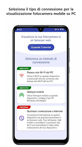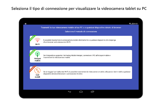 Scegli tra 2 tipi di connessione come Rete Wi-Fi e Mobile hotspot per stabilire una connessione con il tuo PC o dispositivo mobile. Puoi passare facilmente dalla rete Wi-Fi all hotspot mobile. Proprio come qualsiasi buona telecamera IP, questa applicazione funziona anche con software di videosorveglianza, come - Security Monitor Pro e IP Camera Viewer.