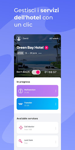 Non è più necessario perdere tempo e andare alla reception, superare la barriera linguistica e spiegare con gesti. L'applicazione tradurrà tutti i messaggi in una lingua adatta a voi in tempo reale.Qualsiasi servizio, dalla richiesta di cambio di asciugamani all'ordinazione di un trasferimento in aeroporto, è disponibile tramite clic.