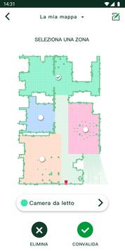 • Zone Personalizzate: l'utente può identificare all'interno della mappa alcune aree specifiche (come la zona pranzo) o intere stanze (come la cucina). Folletto VR300 può essere impostato per pulire solo queste zone nei giorni e negli orari desiderati. Questa funzione è particolarmente utile per ambienti che richiedono una pulizia frequente, ad es. la zona intorno al tavolo da pranzo dopo colazione.