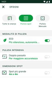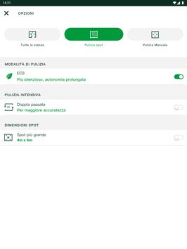 • Modalità di pulizia: puoi passare in un attimo da "Casa" ("Tutte le stanze") a "Spot". Con la funzione Spot puoi comandare la pulizia mirata di piccole zone particolarmente sporche.