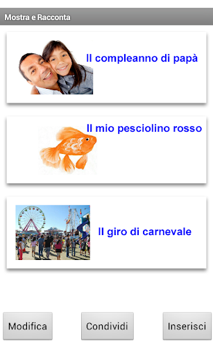 Mostra e Racconta è un modo nuovo, semplice e divertente per condividere racconti ed eventi utilizzando il tablet o smartphone. Bambini, genitori e insegnanti possono utilizzarlo per migliorare la comunicazione con immagini, video, suoni e testo-a-voce. Dal asilo al insegnamento di sostegno, chiunque può beneficiare di questa nova modalita di esprimere ricordi e idee. Versione in lingua italiana.