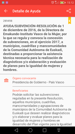 Los resultados de cada búsqueda se muestran de tal forma que en un solo vistazo se obtienen los datos básicos de la convocatoria: título, el órgano convocante, ámbito geográfico de a quienes van destinadas las ayudas, y