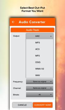 App Supports input audio files like MP4, FLV, MPEG-1,2, MOV, MKV, WMV, AVI, VOB, 3GP, SWF, MP3, AAC, WAV, and more. Simple choose audio from mobile and select format of output audio that you want.