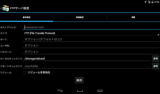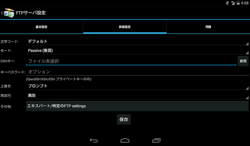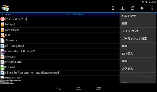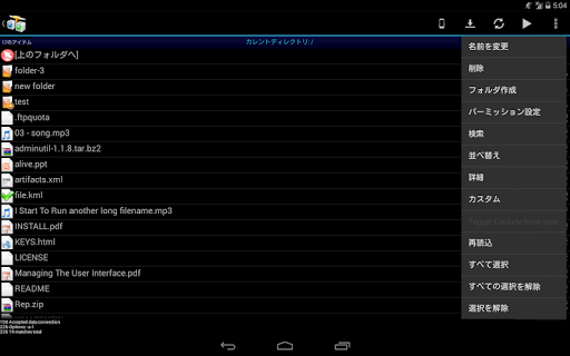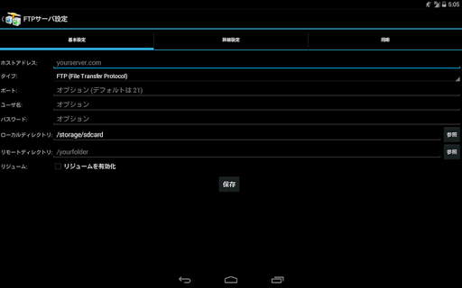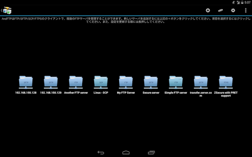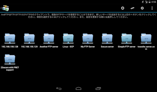 AndFTP はAndroid端末用のFTP/SFTP/SCP/FTPSクライアントです。様々なAndFTPの管理ができ、デバイスファイルブラウザとFTPの両方の操作が可能です。ダウンロードやアップロード機能に加えて、メニューボタンを通してファイル名の変更、ファイルの削除やその他の操作が可能です。また、FTP (File Transfer Protocol)、SFTP (SSH Secure FTP)、SCP (SSH Secure Copy Protocol) そしてFTPS (Explicit FTP over TLS/SSL)に対応します。