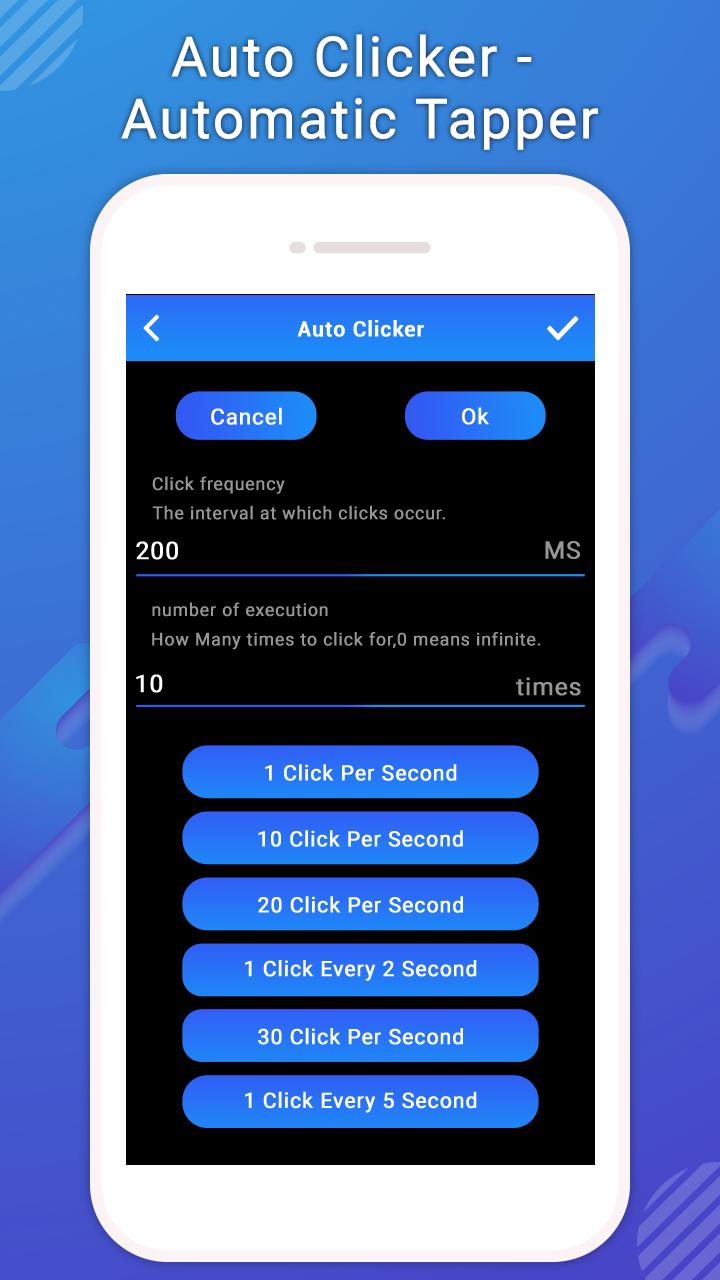 which allows users special option to Click duration to get perfect duration between clicks, and it also option to set Click Counts. This app with you can use it when you need to continue tap on mobile screen with perfect timing, and special you can use it while you are playing a game and you need to continues on the screen to get perfect result, just one tap and it will automatic clicking on your screen with your Click duration.