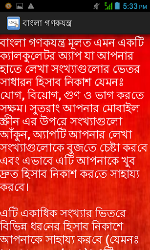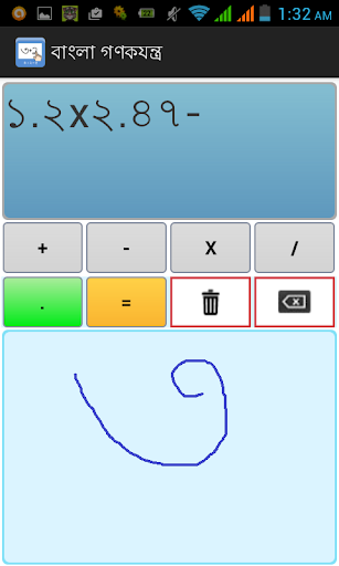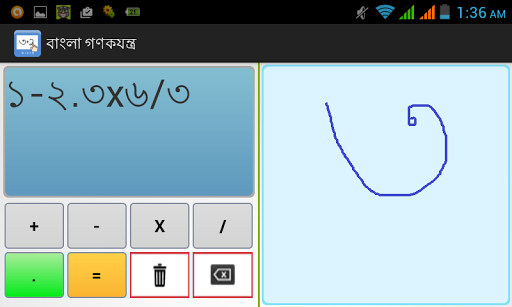 Bangla Handwritten Calculator(বাংলা গণকযন্ত্র) is basically a calculator application that can perform basic mathematical operations such as summation, subtraction, multiplication and division naturally using your handwriting pattern. Draw numbers on your device screen and do some quick calculations through this app.