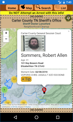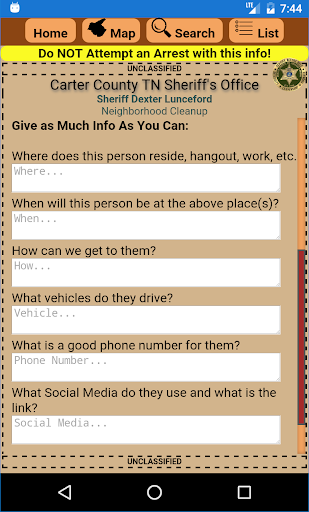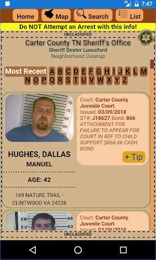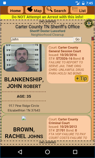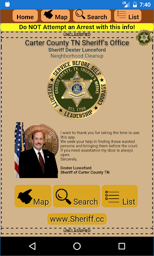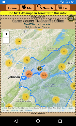 Carter County TNシェリフのオフィス - 近隣クリーンアップ 希望の人の現在のリストと地図。 このアプリを使用する時間をおかげでお願いします。 私たちはこれらの希望の人を見つけて裁判所の前にそれらを持ってくることであなたの助けを求めています。 援助が必要な場合は、常に開いています。 Dexter Lunceford Carter County TNのシェリフ