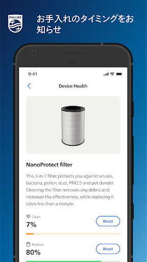 Air は、エアデバイスの部品にクリーニングや交換が必要なタイミングをお知らせしてくれるので、デバイスが最大性能で動作することを可能にします。メッセージと通知は、手間のかからないメンテナンスを行う必要がある場合に送られます。また Air には、必要な場合に参照できる、便利なステップバイステップの説明があります。そしてほとんどの場合、アプリから直接新しいフィルターを購入することも可能です。