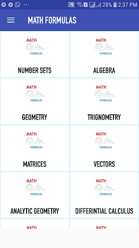 このアプリで利用可能な数学式はこれらのカテゴリの下で入手できます。