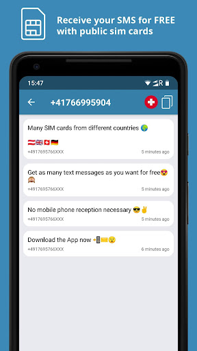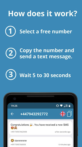Receive SMS is a free service, and it can be started right now without registration. You are given a virtual phone number to use, and you can use that number for as long as you like. The texts will come up on the App as soon as they come through.