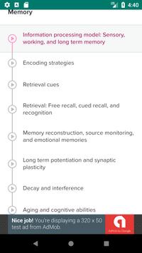 Information processing model: Sensory, working, and long term memory - Encoding strategies , Retrieval cues , Retrieval: Free recall, cued recall, and recognition , Memory reconstruction, source monitoring, and emotional memories , Long term potentiation and synaptic plasticity , Decay and interference , Aging and cognitive abilities , Alzheimer's disease and Korsakoff's syndrome