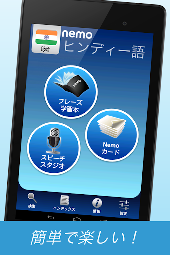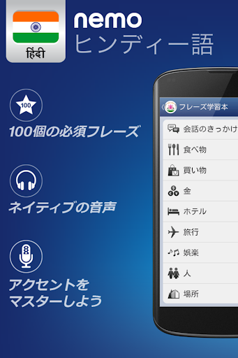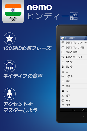Nemoはとても便利なヒンディー語の単語をすぐさま自信を持って話せるように制作されています。世界中から数百万回ダウンロードされるNemoは現在、Androidスマホやタブレットでも利用できます。