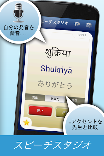 初心者用に必須項目を紹介するために、「10項目だけ学習する」、「50項目だけ学習する」、「100項目だけ学習する」のリストもご用意いたしました。中級学習者は旅行やビジネスで最もよく使用される単語を学習し、1ヶ月以内にヒンディー語で会話できるようになります。上級学習者には外国人アクセントを直すためのスピーチスタジオテクノロジーが効果的です。
