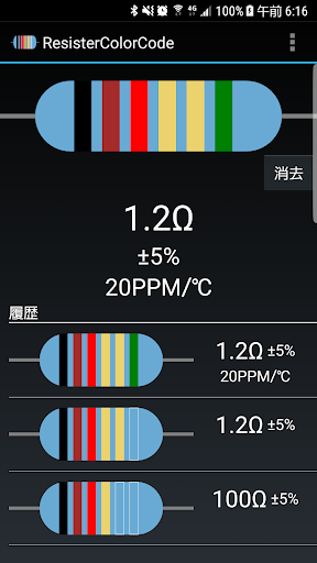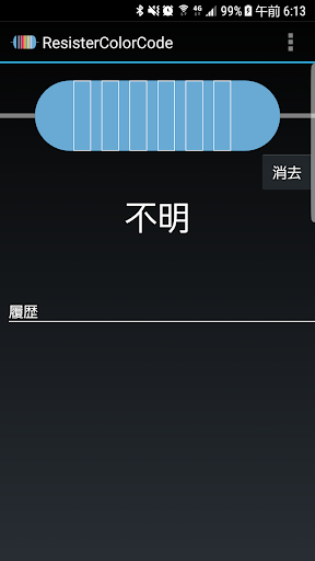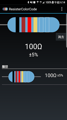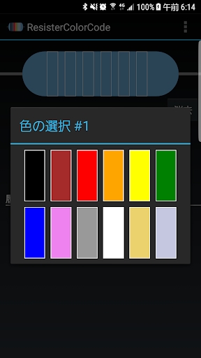 抵抗のカラーコードを入力して、抵抗値を表示するアプリです。 抵抗のイラストをタップして、色を指定します。 次の色が未指定の場合は、次々に色を指定する画面が開きます。 抵抗値は、画面下部に記録されます。