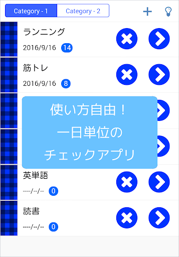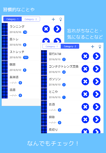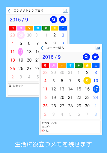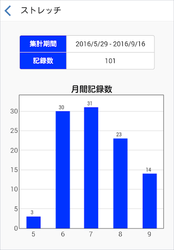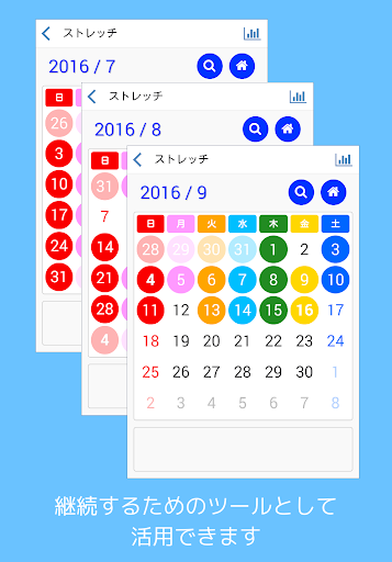 本アプリは、実施した日にちを記録に残していくことにより、継続のモチベーションを維持し習慣化を促す、継続するためのツールとして活用できます。