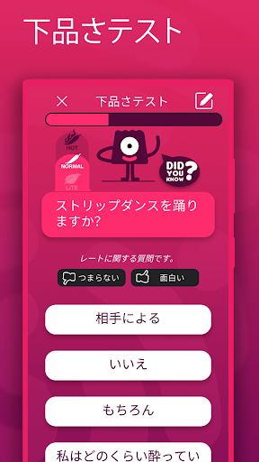 18歳以上の女性と男性のための、最も正確な日本語による心理的下品度テストです。最も興味深く下品な事柄に関するトリッキーな質問で、あなたの乱れ度合いを調べます。心理クイズでは、あなたの乱暴度合いを知り、心理を突き止めることができます。アプリの質問に正直に答えよう!他の人に見られる前に。人見知り解消! 女子と男子の恋愛に関するトリッキーなテスト、恋愛に関するテスト、恋愛とセックスに関するテストです。自己肯定感を高めて、自分を知ってもらう。本当の自分を見つける。