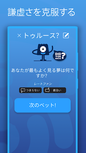 Truth or Dareは、友人同士のグループにとって興味深いゲームです。リラックスした雰囲気の中で、社会的な交流を最大限に深めながら、一緒に時間を過ごすことができるのです。他のプレイヤーの回答を聞くことで、参加者それぞれの心理描写やIQレベルの把握ができ、テストなしで相性を知ることができるのです。心理学では、アプリの回答から本当か嘘かを見抜くことができます。