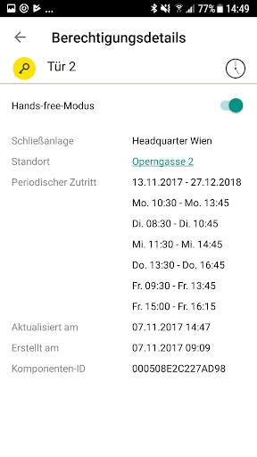 타협하지 않는 보안! 스마트 폰과 닫는 구성 요소 간의 통신은 암호화 된 엔드 - 투 - 엔드이므로 절대적으로 무시합니다. 앱을 추가 핀으로 보안 할 수 있습니다. 열쇠 고리는 또한 예술의 마지막 상태에 해당하며 복사 할 수 없습니다. 직원, 프리랜서 또는 휴일 손님과 같은 사람에게 간단히 주요. 이것은 특정 기간 동안 사전 프로그래밍됩니다.