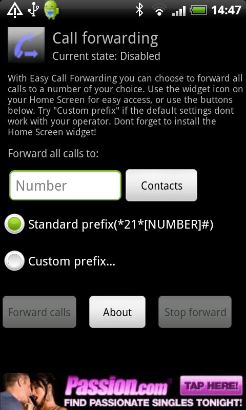 Do call forwarding in a second. Enter target forward number once, enable call forwarding with one click on the home screen widget Install the widget by long-touching the Home Screen.