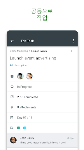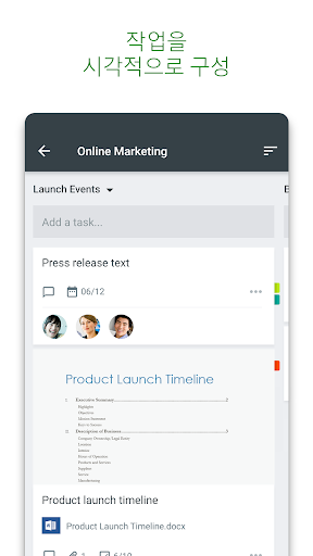 Office 365용으로 작성된 Planner를 사용하여 같은 작업에 대해 함께 작업하고 캡처된 사진을 작업에 바로 첨부하고, 앱 간을 전환하지 않고도 작업과 관련된 대화를 나눌 수 있습니다. 또한 모든 팀 토론 및 결과물이 계획과 함께 보관되며 다른 응용 프로그램 간에서도 잠겨지지 않으므로 계속 사용할 수 있습니다.