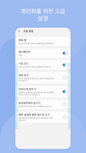 또한, 게임과 같이 터치 간섭이 심한 경우에는, [고급 설정] 에서 [제외 앱] 설정을 하면, 해당 앱 실행 시 제스처 핸들이 사라져서 동작하지 않게 됩니다.