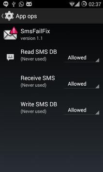 NOTE: since the recent Android 4.4 releases (for example CyanogenMod 11) you may have to go in Settings -> Privacy -> Privacy Guard (or equivalent App Ops feature) and push for a few seconds on the SMSFailFix slot in order set "Write SMS DB" to "Allowed" (as shown in the third screenshot). This app will not be effective if "Write SMS DB" is set to "Denied" (i.e. the default setting in CyanogenMod 11). After allowing "Write SMS DB" you may want to start the app just once, like if it was the first time you run it after installing it. The procedure described in this paragraph to allow "Write SMS DB" takes only a few seconds and it works fine on CyanogenMod 11. Android versions older than 4.4 don't require this procedure.