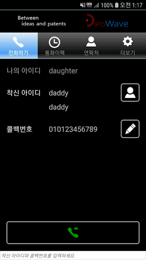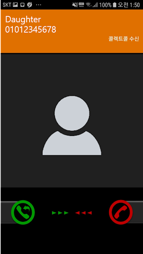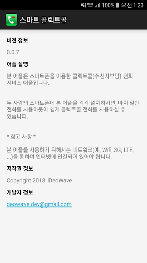 두 사람의 스마트폰에 본 어플을 각각 설치하고 사용하시면 콜렉트콜(수신자 부담) 전화를 일반 요금으로 사용하실 수 있습니다. 본 어플은 콜렉트콜(수신자 부담) 요청을 위해 데이터를 사용합니다. 본 어플을 사용하기 위해서는 스마트폰이 네트워크(예, Wifi, 3G, LTE, ...) 를 통하여 인터넷에 연결되어 있어야 합니다.