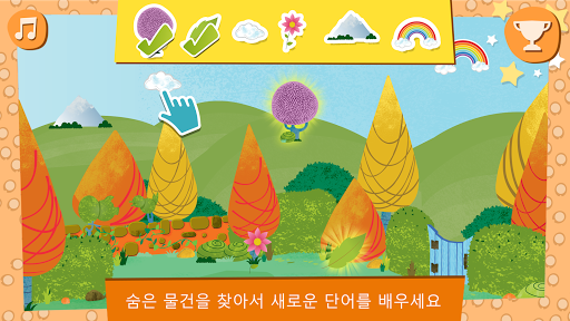 - 어휘력을 높이기 위해 숫자, 색, 모양, 음식, 동물, 교실 물건, 장난감 등 최대 60개의 영어 단어와 구문을 찾아봅니다.