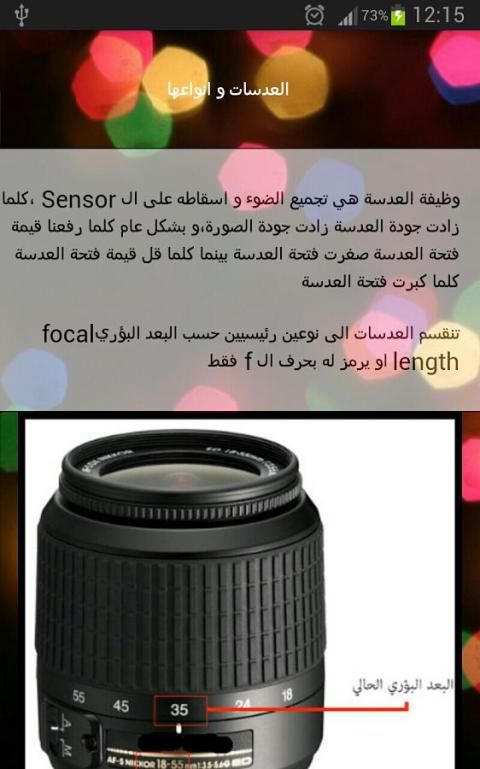 Using this application you can identify the basic principles upon which to build digital cameras, in addition to the types of types of cameras and lenses, as you will learn what lenses are used in various imaging modes, also learn how to get more accurate images when shooting using the mobile phone or mobile