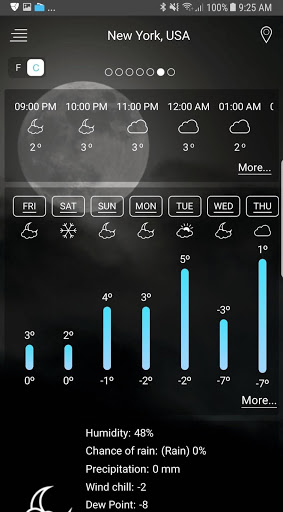 The weather app also provides atmospheric pressure, weather conditions, visibility distance, relative humidity, precipitation in different unites, dew point, wind speed and direction, in addition to ten days in future and hourly weather forecast.