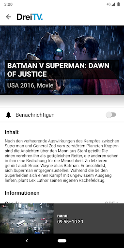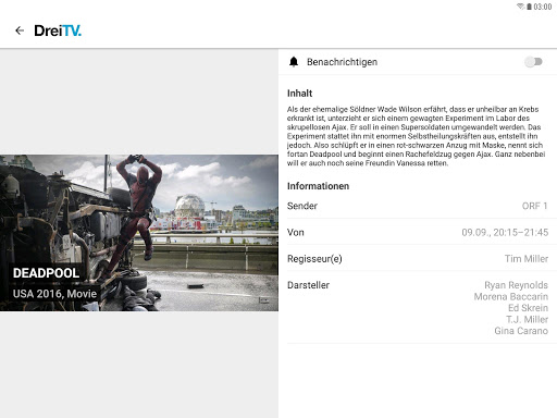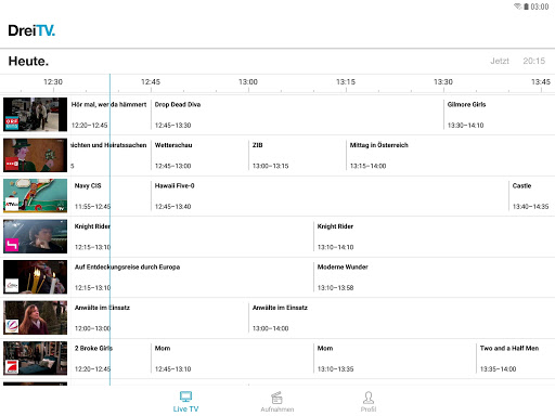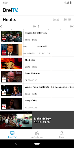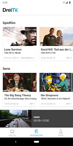 흥미 진진한 스포츠 방송, 가장 좋아하는 시리즈, 흥미 진진한 기능 영화 또는 집에서 집에서 즐거운 어린이 프로그램을 갖춘 TV를 경험하거나 3 개의 TV로 원하는 곳에서는 텔레비전 프로그램, HD의 절반 이상. 오프 1, ORF2, ATV, PULS4, Servustv, ProSieben, Sat.1, Eurosport, Dmax 및 훨씬 많은이 TV 앱에 대해 더 많은 환영합니다. 귀하의 개인 비디오 레코더 : 귀하의 개인 비디오 레코더 TV 앱이 저장되고 시간이 있으면 좋아하는 프로그램을 볼 수 있습니다. 로그인 할 때 "녹음 기능"옵션을 활성화하십시오. 녹음 시간이 시작됩니다.