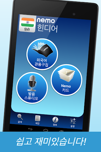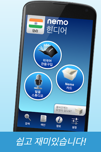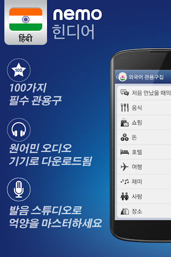 궁금한 단어가 있으면 언제든지 확인해 보세요. 앱의 외국어 관용구집을 이용하면, 힌디어-한국어 사전 인터페이스를 통해 금방 해당 어휘를 확인할 수 있습니다. Nemo는 번역사의 역할도 합니다. 원하는 단어를 검색한 다음, 오디오를 재생하여 장치의 스피커로 들으시면 됩니다.