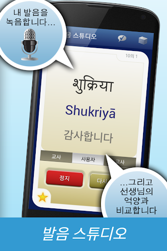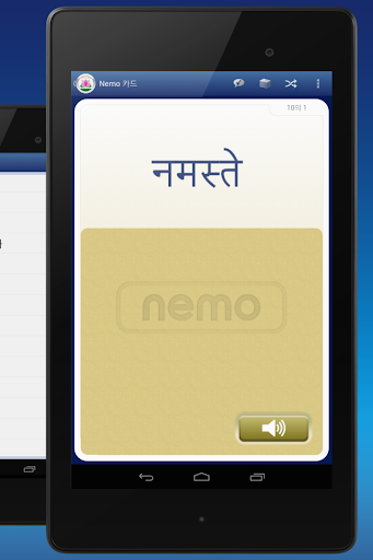 Nemo의 플래시카드를 설정하여, 가장 향상시키고 싶은 언어 능력을 중점적으로 연습할 수 있습니다. 새로운 주제가 시작되면, 힌디어를 한국어로 번역하는 연습을 할 수 있도록 플래시카드를 설정하여 새로운 단어에 익숙해지세요. 그 다음, 한국어를 힌디어로 다시 번역해 보세요. 그러면 기억력과 말하기 능력이 향상됩니다. 단어를 완전히 익히려면, 원어민의 정확한 발음을 듣고 자신의 발음을 교정할 수 있는 카드로 전환하세요.