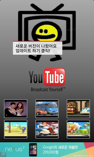 20121105 Added channels Hutos season 2 series, Tobot 1 8 series 20121101 Fixed some bugs Added sharing feature with KaKao Talk Improved 2 column per row of ListView on landscape mode 20121024 Fixed some bugs Improved performance of ListView Removed channels not supported 20120921 Added channelsPSY Kangnam Syle Series 1,2 20120731 Added channelsEnglish Story book, Singing with Pororo... 20120705 Fixed some bugs about storing channel Supported japanese language 20120702 Play it when you click thumbnail Improved screen update 20120630 Fixed some bugs 20120617 Added new contents 38 items, such as ROBOCAR POLI Added Edit Channel for your favoriteHave you felt it is difficult to find favorites YouTube movies for your children?iYouTube enables you to remove your such inconvenience.Simply, please touch characters likePororo, Tayo, Chiro, Hutos, Burmiz, Cocomong, Robocar Poli your children love, and then you can get the series sorted as the type of list, and you can see contents you chose on list through YouTube.We are going to launch next series continuously in the near future.If you would like to see not only the series of YouTube movies for kids, but also KPOP music video, Teaser movies, concert movies, please upload reviews, comments on google Play, our blog site.