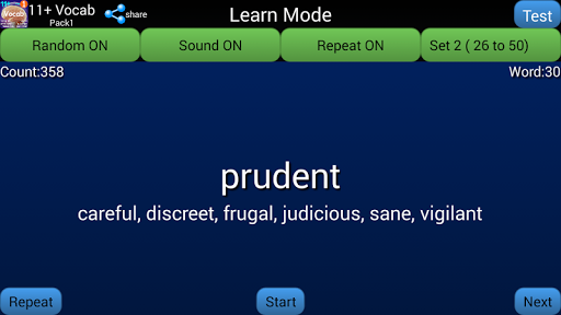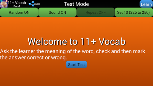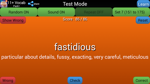 - In Test mode app says a word, then the learner has to guess one or more synonyms, then press Check button. Then mark the answer Correct or Wrong
