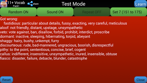 - Show wrong screen shows all the words the learner got wrong. This can be Reset
